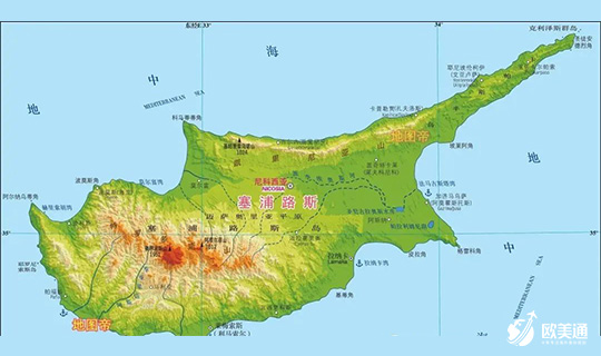 塞浦路斯,位于地中海东部,是地中海第三大岛,地处在欧、亚、非三大洲海上交通要道,占据着一个极为重要的位置。塞浦路斯的面积只有9251km²,但阳光明媚,环境优美,景色迷人,是著名的旅游和度假圣地。